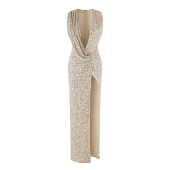 High-End V-Hals Clubjurk Met Lichte Luxe Lovertjes Natuurlijke Taille En Logo Terug Voor Catwalk-Hosting Of Avondkleding